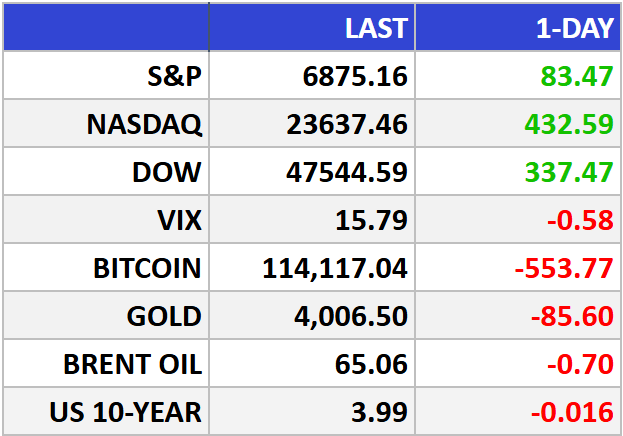 The S&P 500 climbed +1.23% to 6,875.16, marking its first close ever above the 6,800 level. The Nasdaq Composite surged +1.86% to 23,637.46, while the Dow Jones Industrial Average gained 0.71% to 47,544.59âall at record highs.